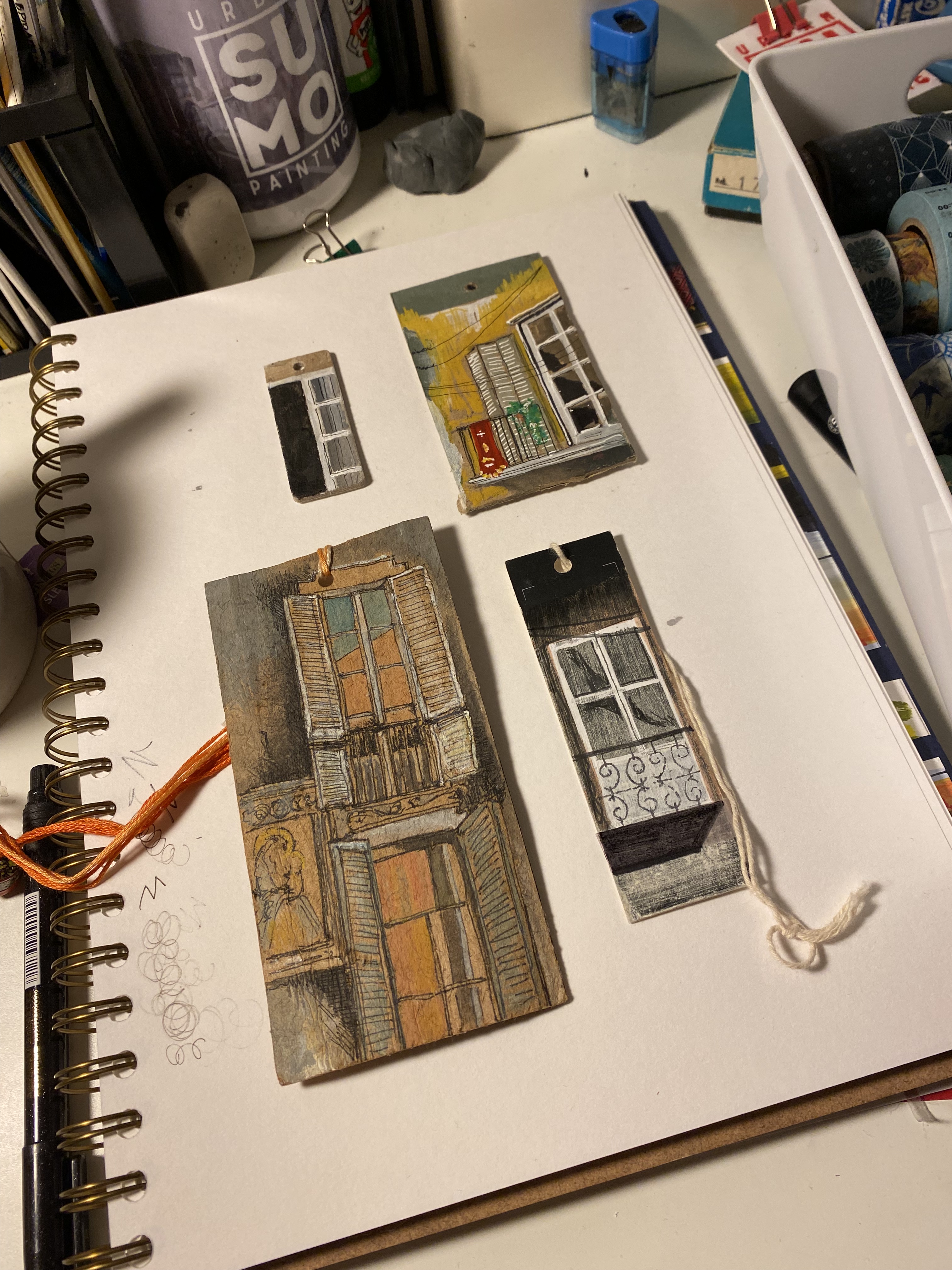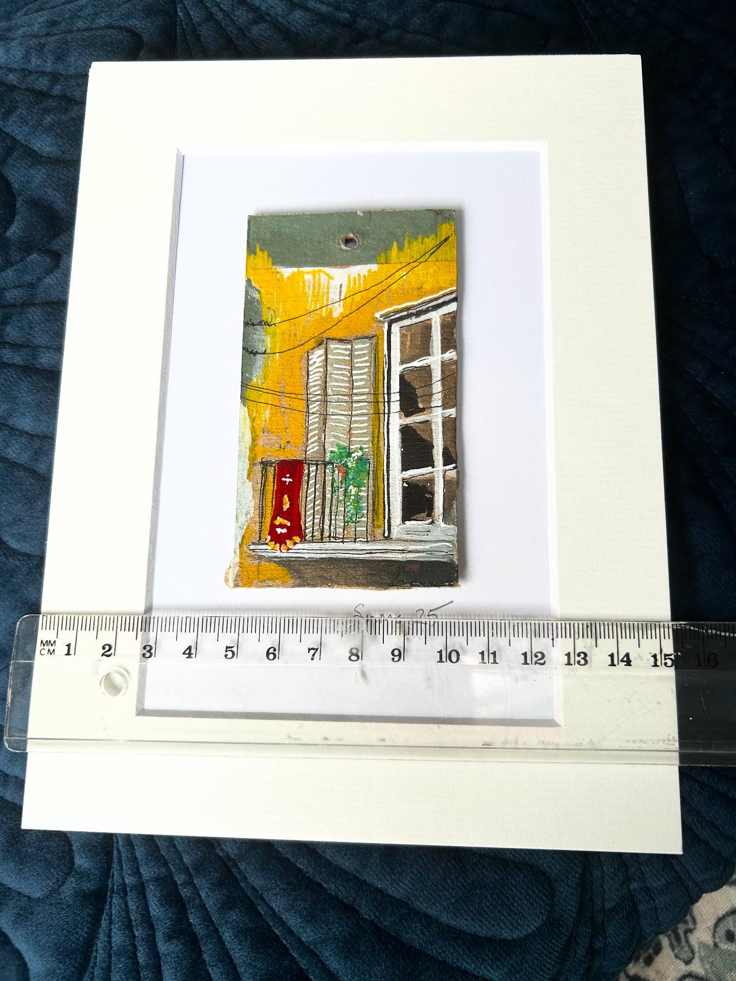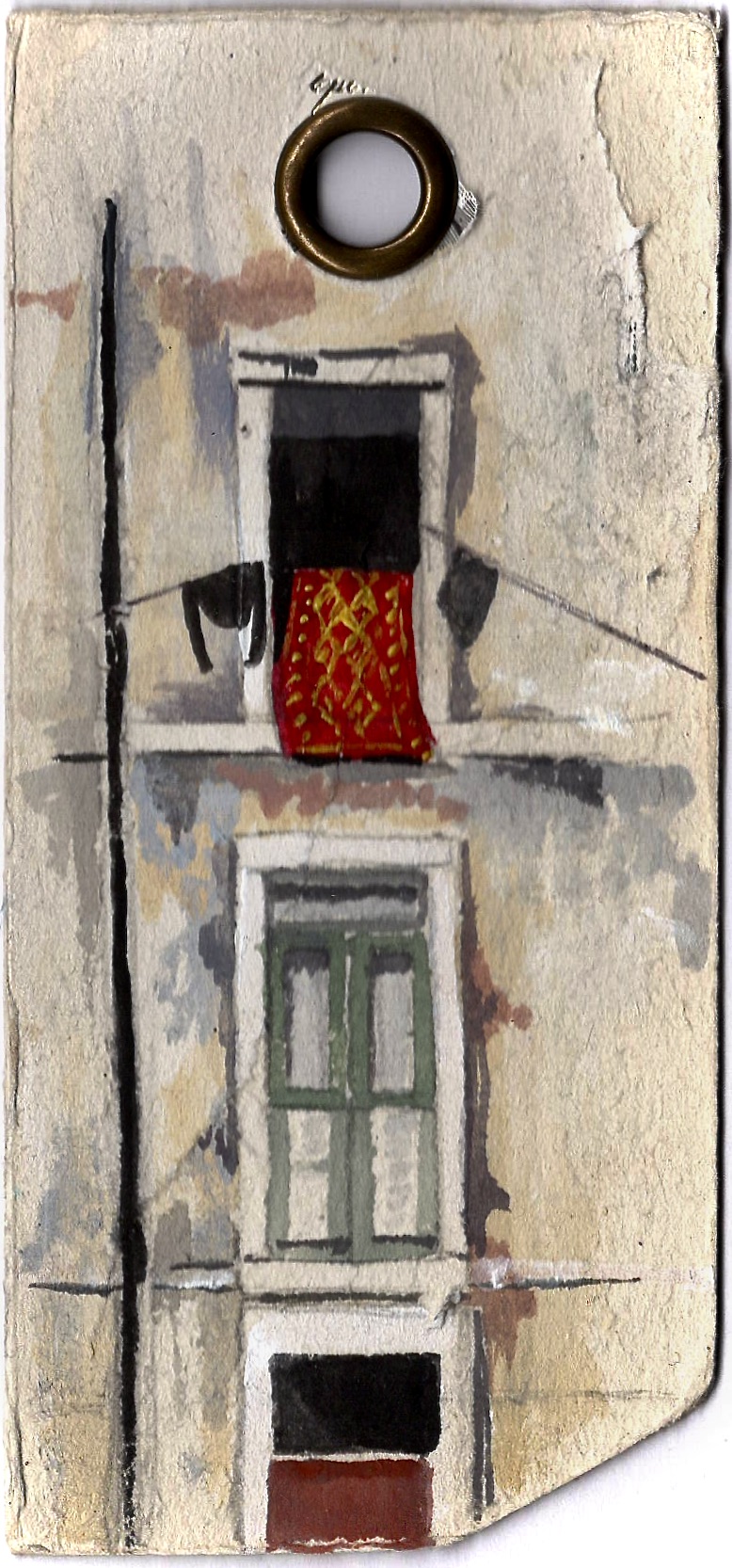 I have been exploring these small originals painted onto recycled clothes labels. I really like them, they are only small, but I texture up the surface and work I mixed media. They are mainly reflections of buildings spotted in Lisbon, Portugal and Italy. I am hoping to sell some of these mounted. However, some I love and cannot seem to think about selling. That is the problem with creating.